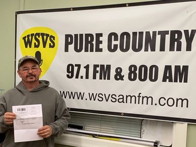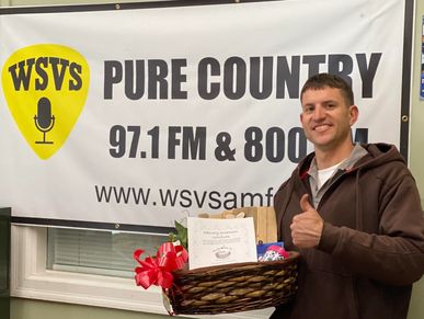 HE WON A GIFT CERTIFICATE GOOD FOR A FREE LARGE PIZZA WITH HIS CHOICE OF UP TO 5 TOPPINGS FROM BRAVO'S ITALIAN GRILLE IN CREWE!